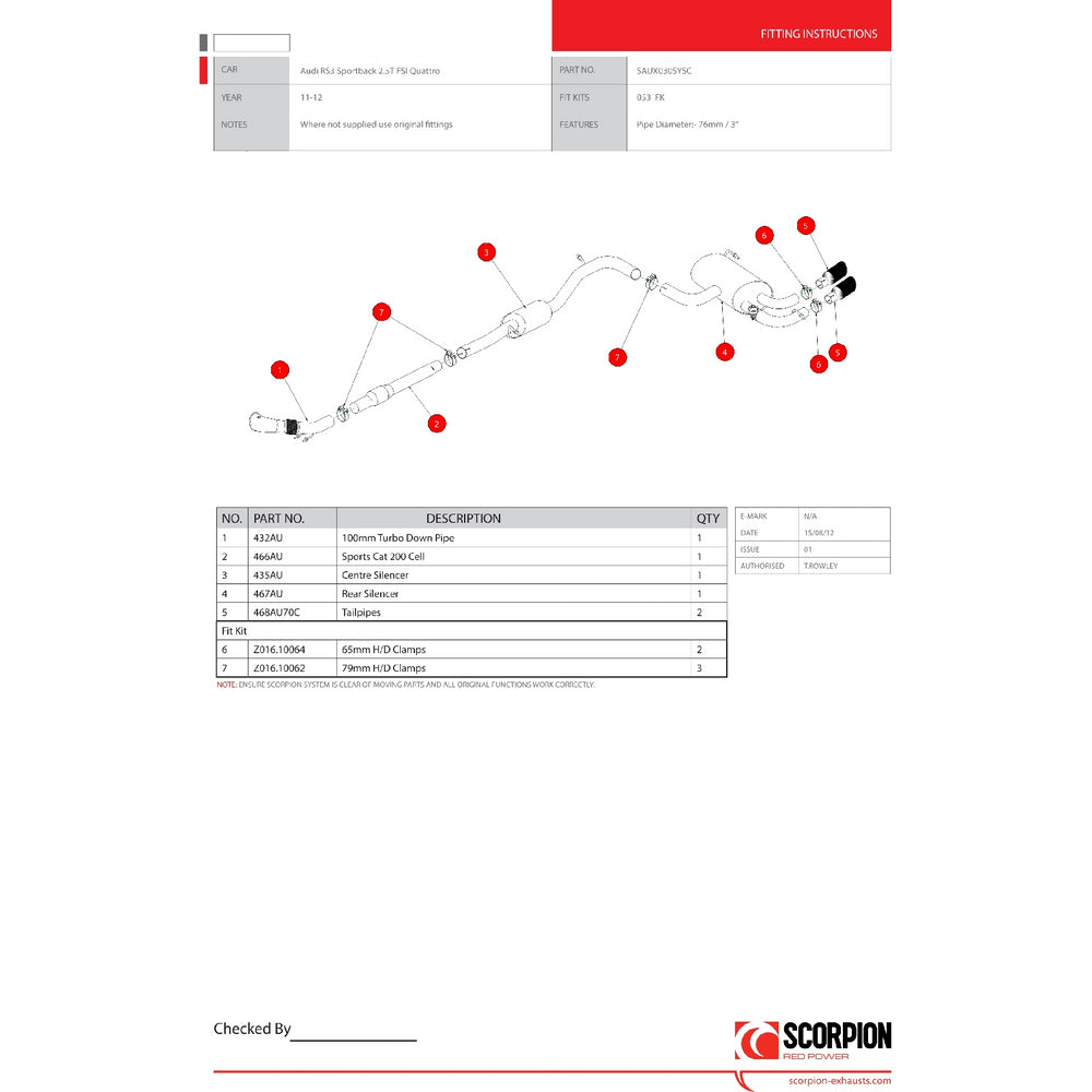 - SAUX030SYSC - Scorpion Car Exhaust Turbo-Back System with High Flow Sports Catalyst - Audi RS3 2011 - 2012, consisting of: