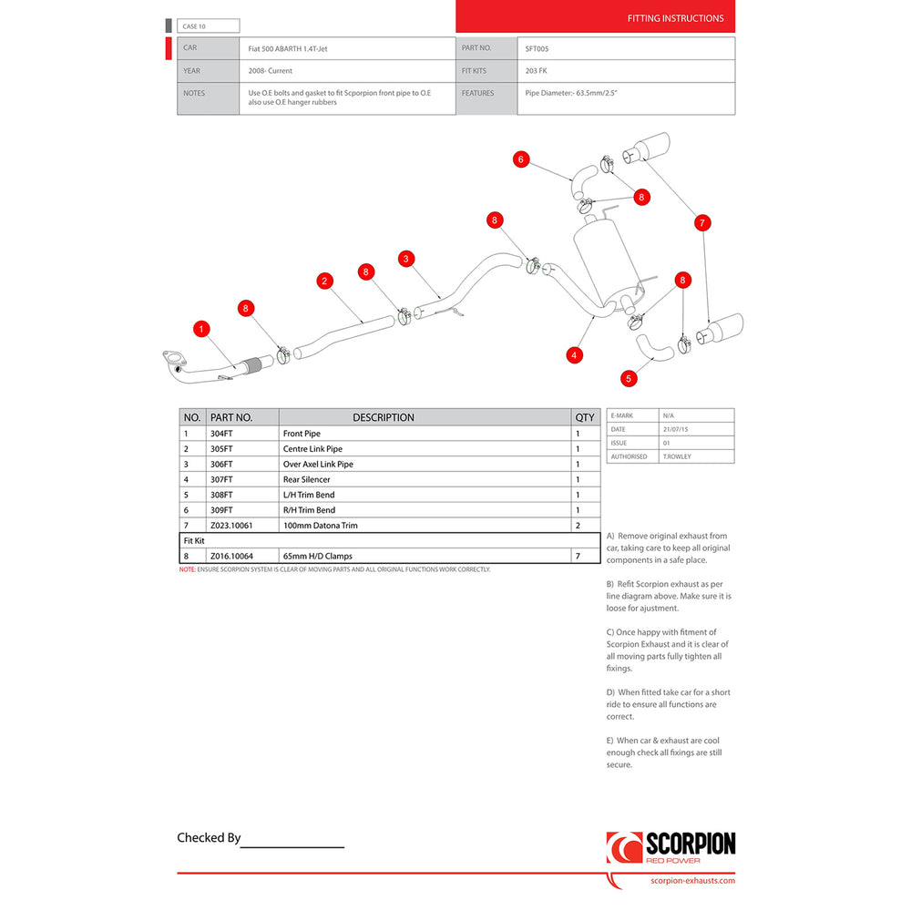 - SFT005 - Scorpion Car Exhaust Cat-Back System (Non-Resonated) - Fiat 500 Abarth 1.4 Turbo 2008 - 2018
