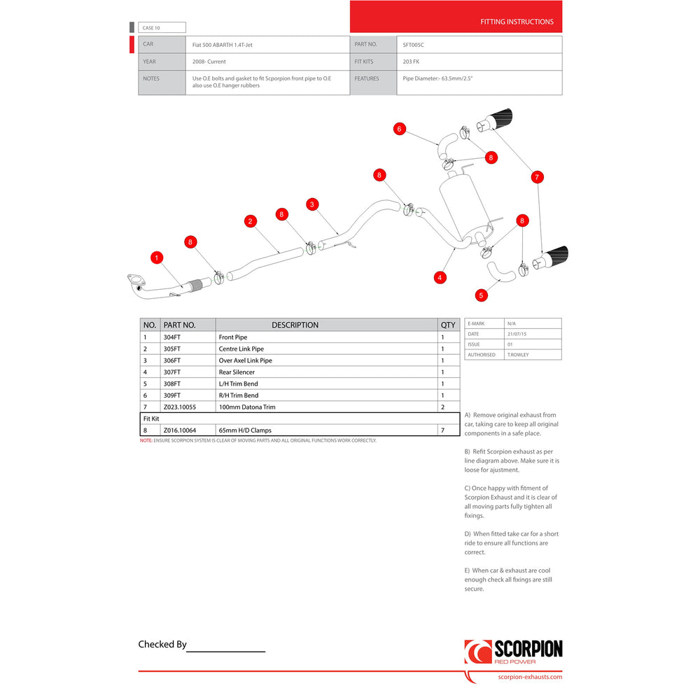 - SFT005C - Scorpion Car Exhaust Cat-Back System (Non-Resonated) - Fiat 500 Abarth 1.4 Turbo 2008 - 2018