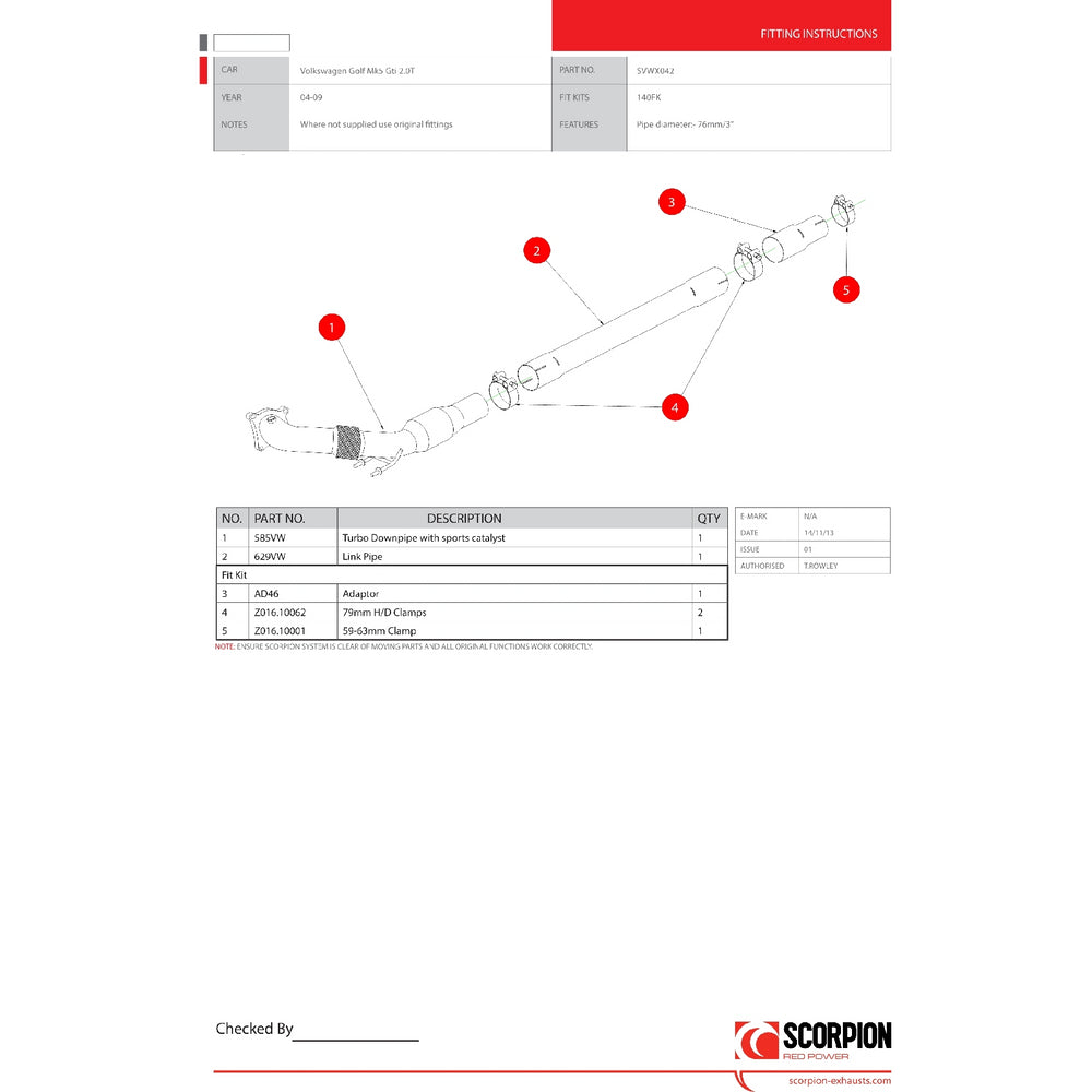 - SVWX042 - Scorpion Car Exhaust Downpipe with High Flow Sports Catalyst - Volkswagen Golf MK5 GTI & Edition 30 2004 - 2009, consisting of: