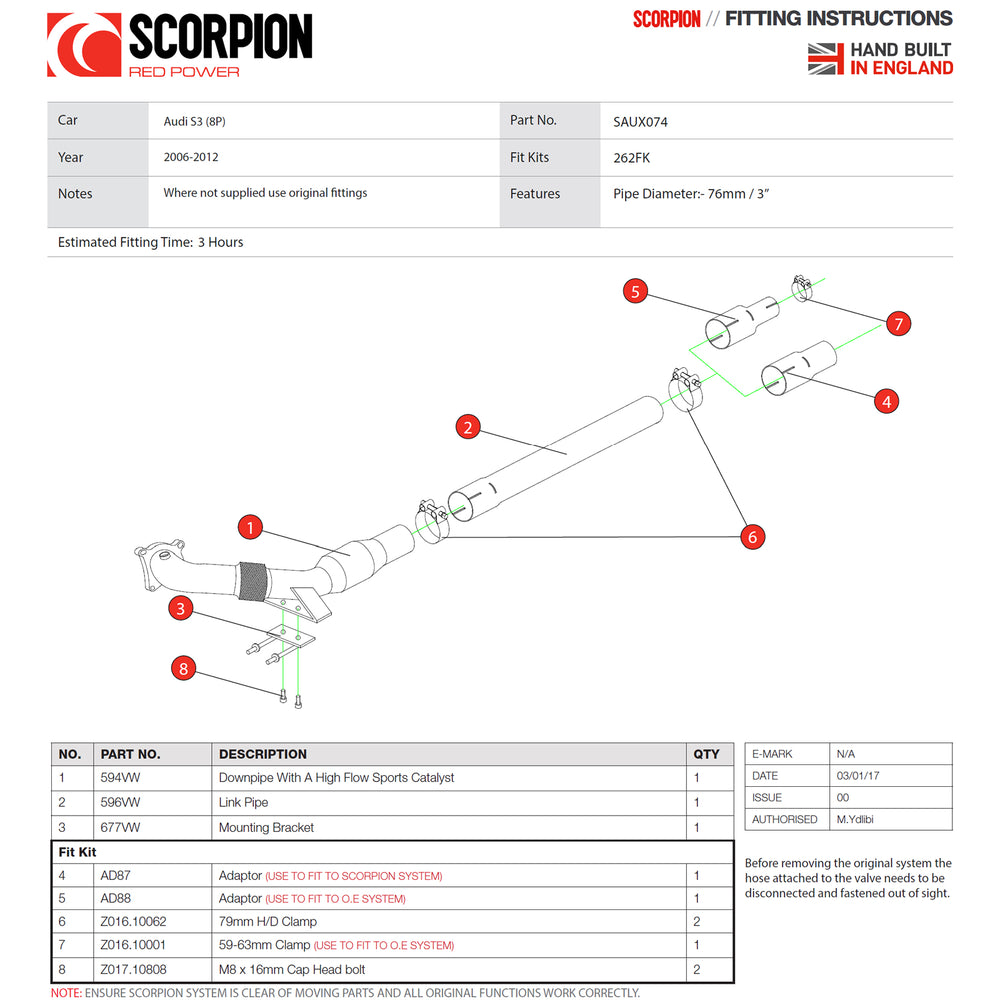 - SAUX074 - Scorpion Car Exhaust Turbo-Downpipe with High Flow Sports Catalyst - Audi S3 8P 2.0T Quattro (3 Door & Sportback) 2006 - 2012, consisting of: