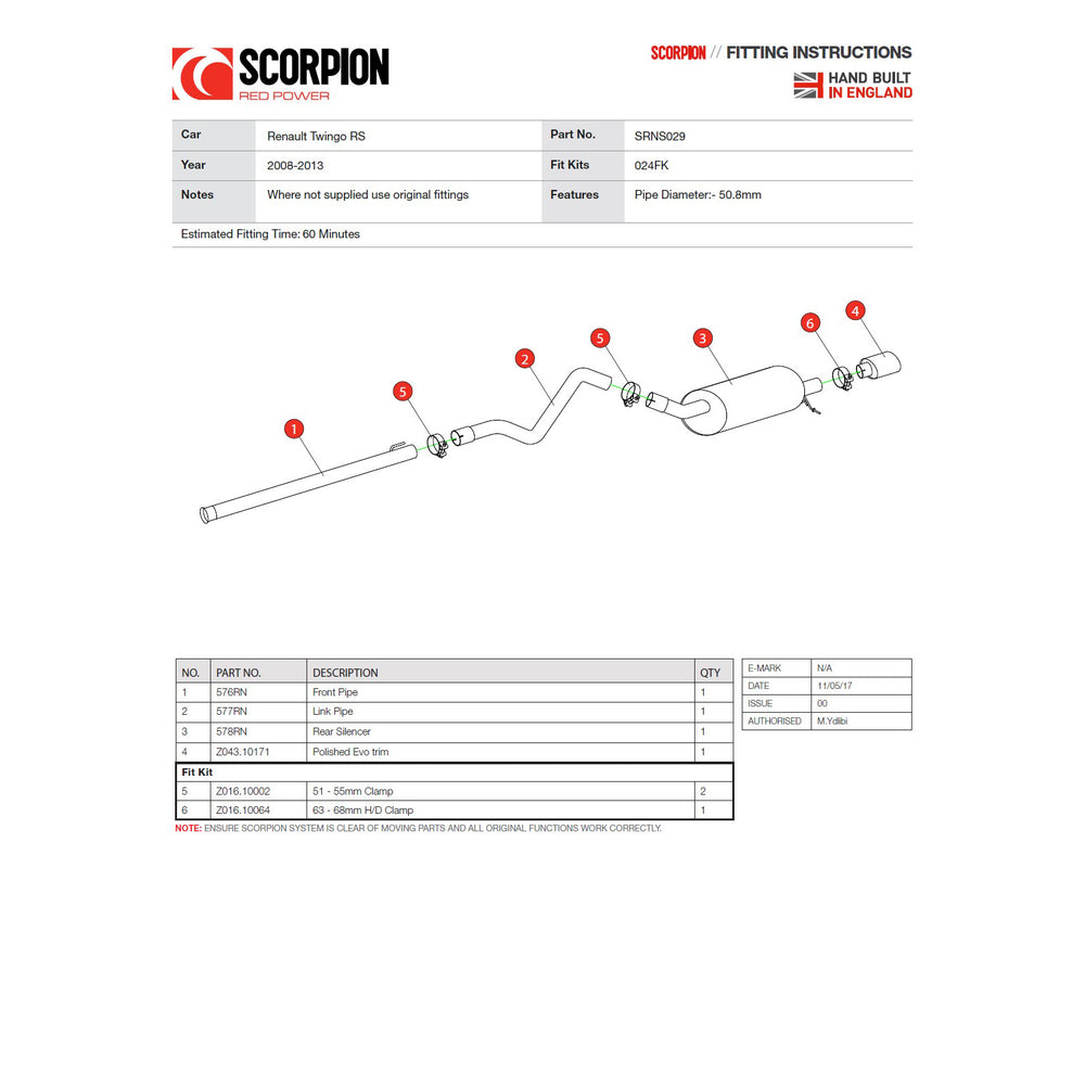 - SRNS029 - Scorpion Car Exhaust Cat-Back System (Non-Resonated) - Renault Twingo RenaultSport 2008 - 2013, consisting of: