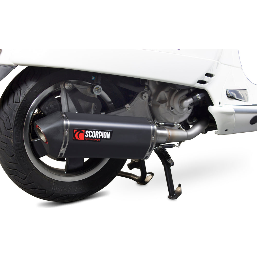 Now available from GhostBikes is the Scorpion Red Power Exhaust. This particular exhaust will fit a Vespa Vespa GTS125, GTS250, GTV250, GTS300 SUPER & GTV300 SUPER 2009 - 2018. Red Power evokes the passion, performance and heat of competition drawn from over 20 years of motorsport tuning and racing success. It embodies Scorpion's drive for continuous engineering superiority, product and performance refinement, and above all sheer riding and driving enjoyment. Red Power also gives you the comfort factor that the system you have specified has been hand crafted by a Scorpion automotive engineer in the UK - not mass produced in the far east like many of today's most expensive brands whose popularity is simply the result of paid endorsements, media manipulation and advertising hype. Treat your bike, get a Scorpion Exhaust System from GhostBikes today!