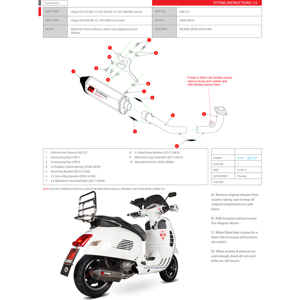 - RVE211BCER - Scorpion Serket Parallel Black Ceramic Oval Exhaust - Vespa GTS125 / GTS250 / GTV250 / GTS300 SUPER / GTV300 SUPER Full System 2009 - 2018, consisting of: