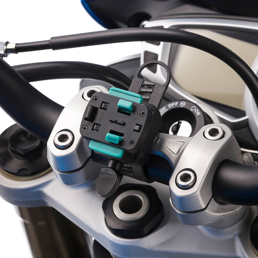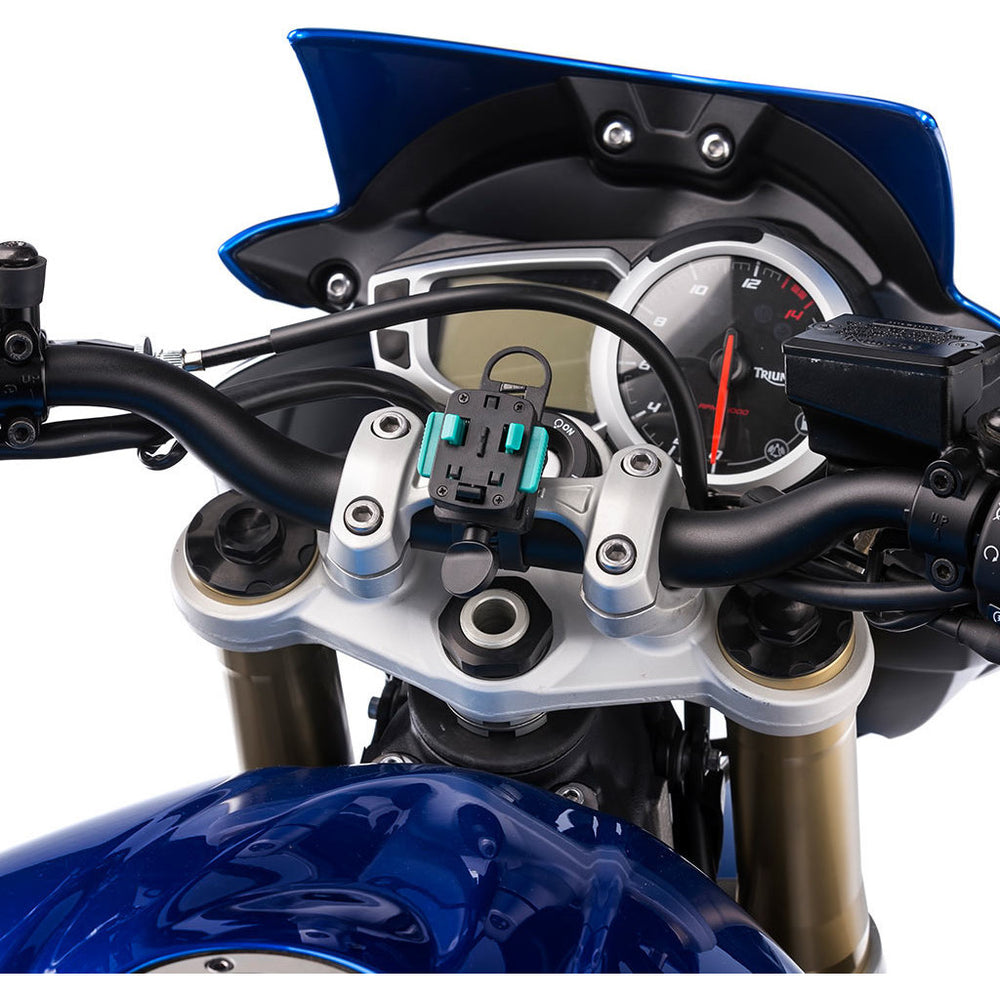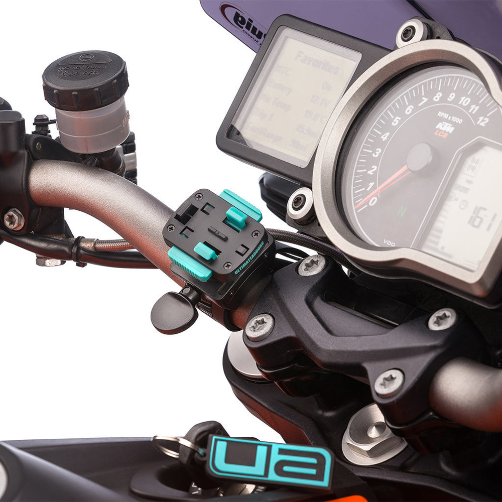 This motorcycle handlebar mounting attachment has been designed to fit large diameter handlebars ranging from 21-40mm. No tools are required to fit this mounting attachment, simply thumbscrew to tighten.