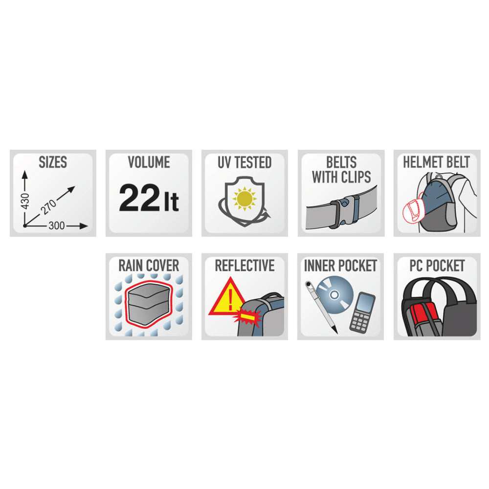 Rucksack with thermoformed shell and 22-litre capacity. Designed specifically for sporty motorcycles, its features give it perfect stability even at high speeds.