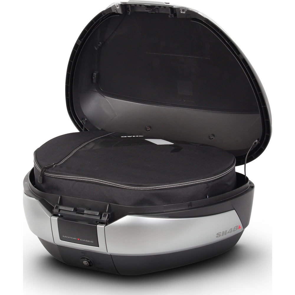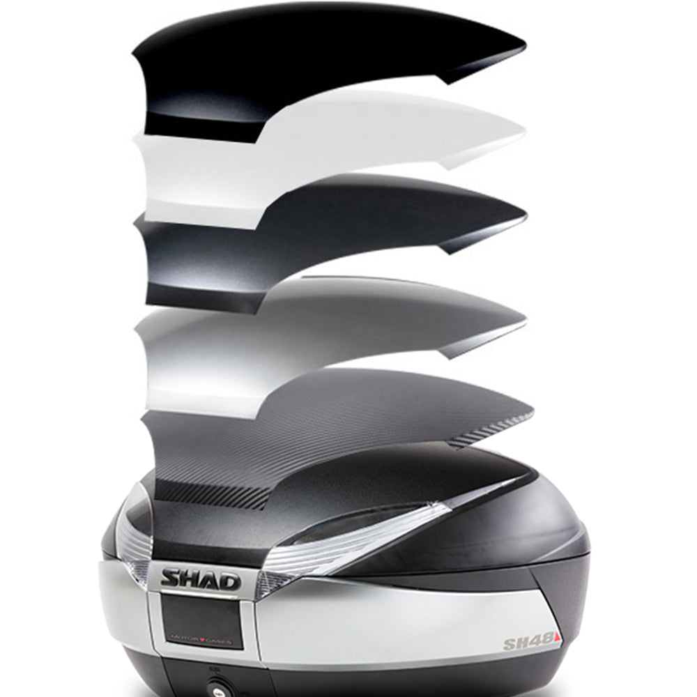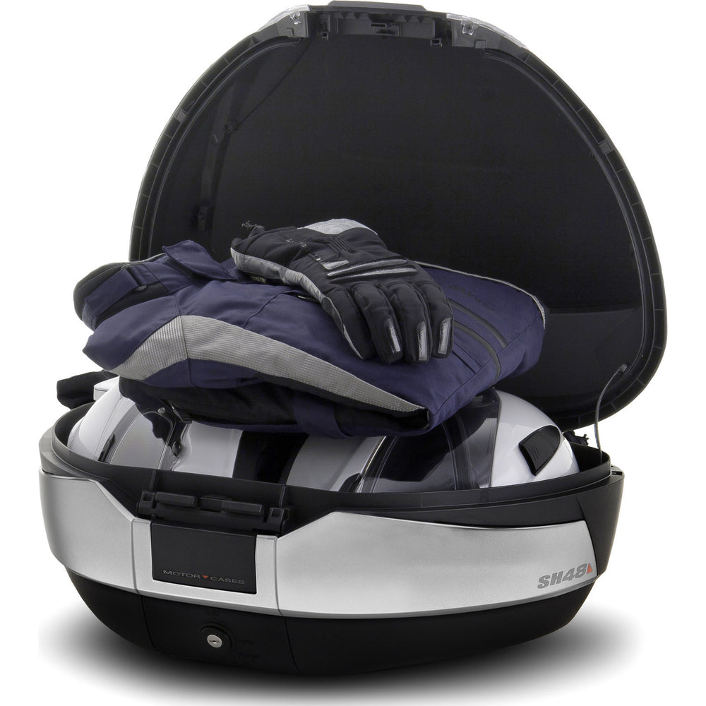 The SH48 top case is a larger sized box in SHAD's hard luggage range, weighing just over 4 kg but still being able to comfortably carry 2 flip front helmets or a flip front helmet and lots of accessories, making it perfect for bigger bikes. It is fully waterproof, aerodynamic, aesthetically designed with a fully rounded body and titanium side bands, with integrated reflectors as well as colour change options. The SH48 top box is highly impact resistant with minimal thickness for ultra lightness.