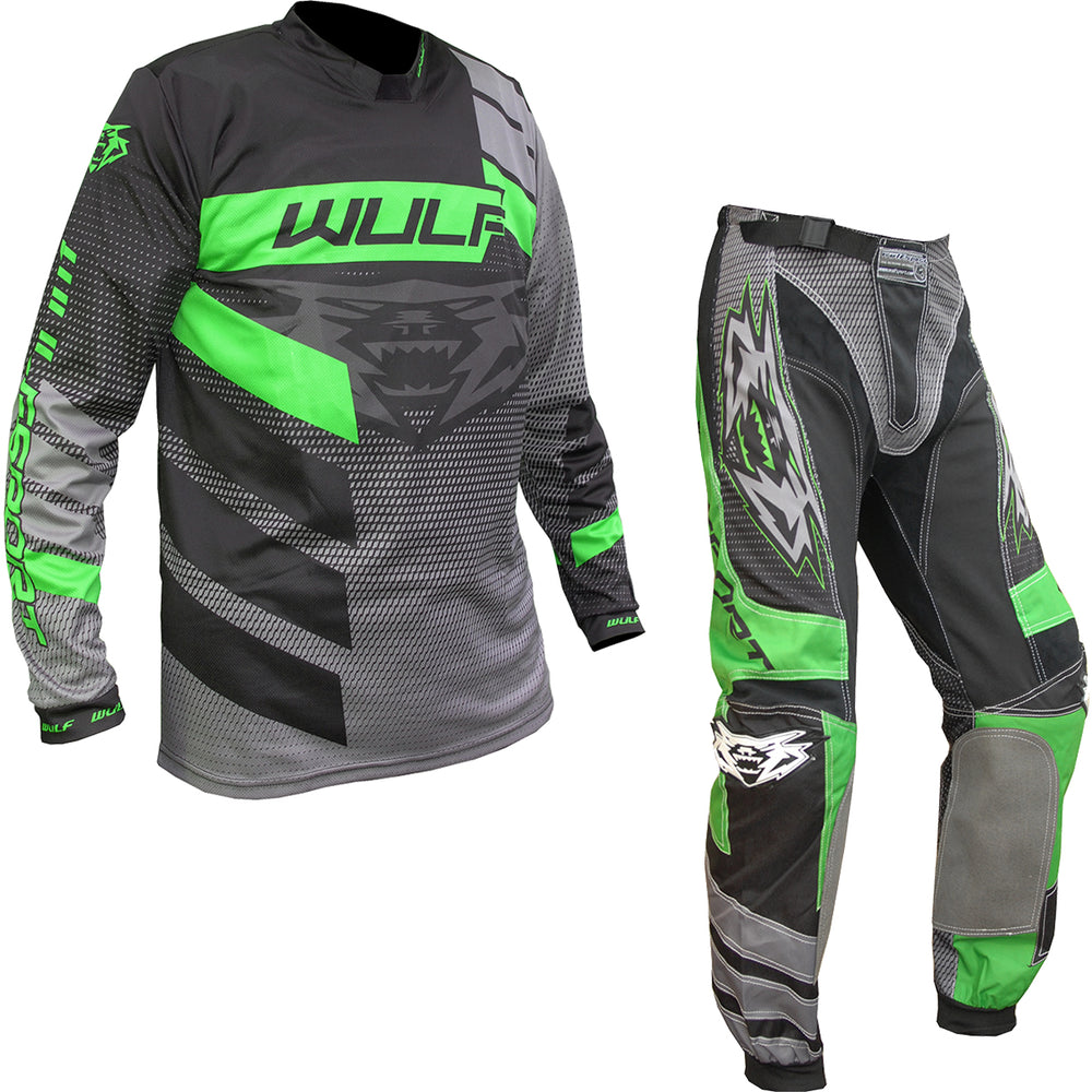 The Wulf Matrix Cub Kids Motocross Jersey & Pants Green Kit is part of the latest Wulfsport collection.