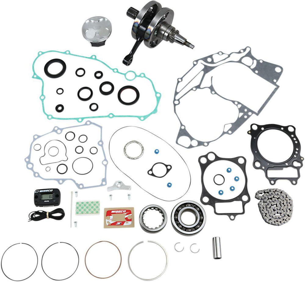 - Main bearings, seals, gaskets, a Wiseco hour meter and bracket are also included in the kit Kit Includes: • Crankshaft Assembly • Piston Kit #40114M07680 • Top End Gasket #W6805 • Bottom End Gasket #WB1177 • Main Bearing #B5052/B5056 • Cam Chain #CC024 • Hour Meter with Mount #W8063/W8062 • Maxima Assembly Lube