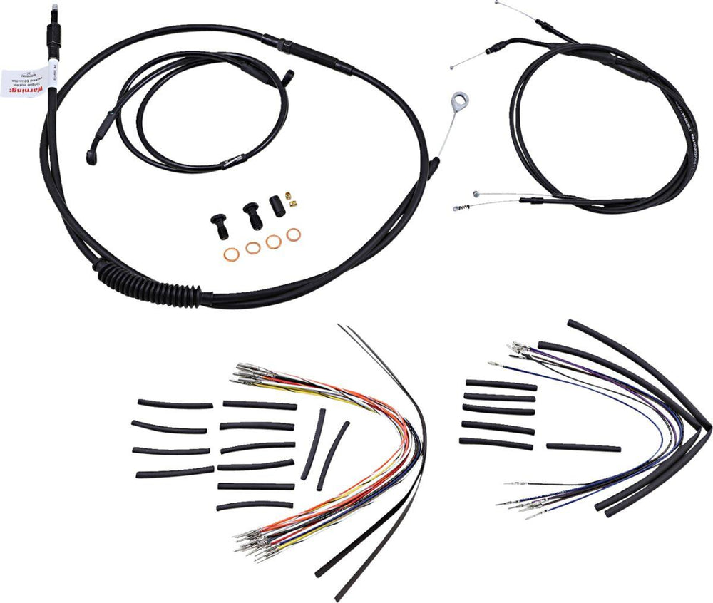 - Kit is based on using 2" risers with ape hanger-style handlebars. Includes extended single-disc black braided steel brake line, extended clutch cable, extended throttle cables and all necessary wiring.