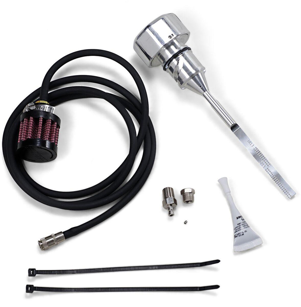 - Includes 2 different venting style options for installing the dipstick: option 1 - 1/8 NPT breather vent fitting with internal porous filter element, option 2 - quick disconnect coupler fitting with rubber hose and filter element