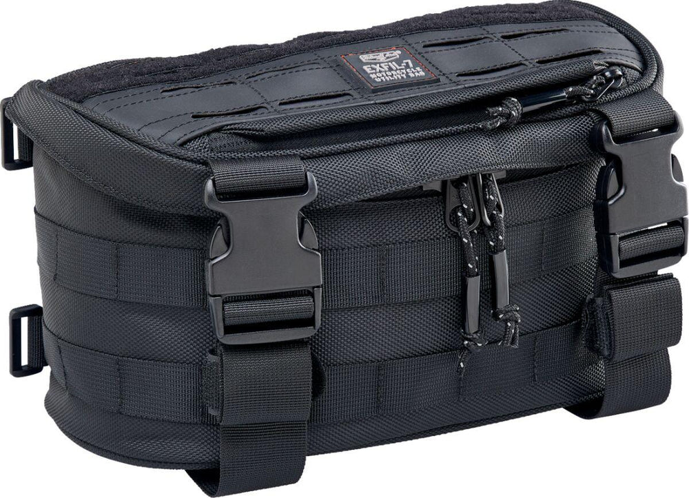 - Install the EXFIL-7 bag on your frame's down tubes, above the headlight, on tall and mid-sized handlebars, and of course on either side of a sissy bar (in front of the taillight and behind your lower back