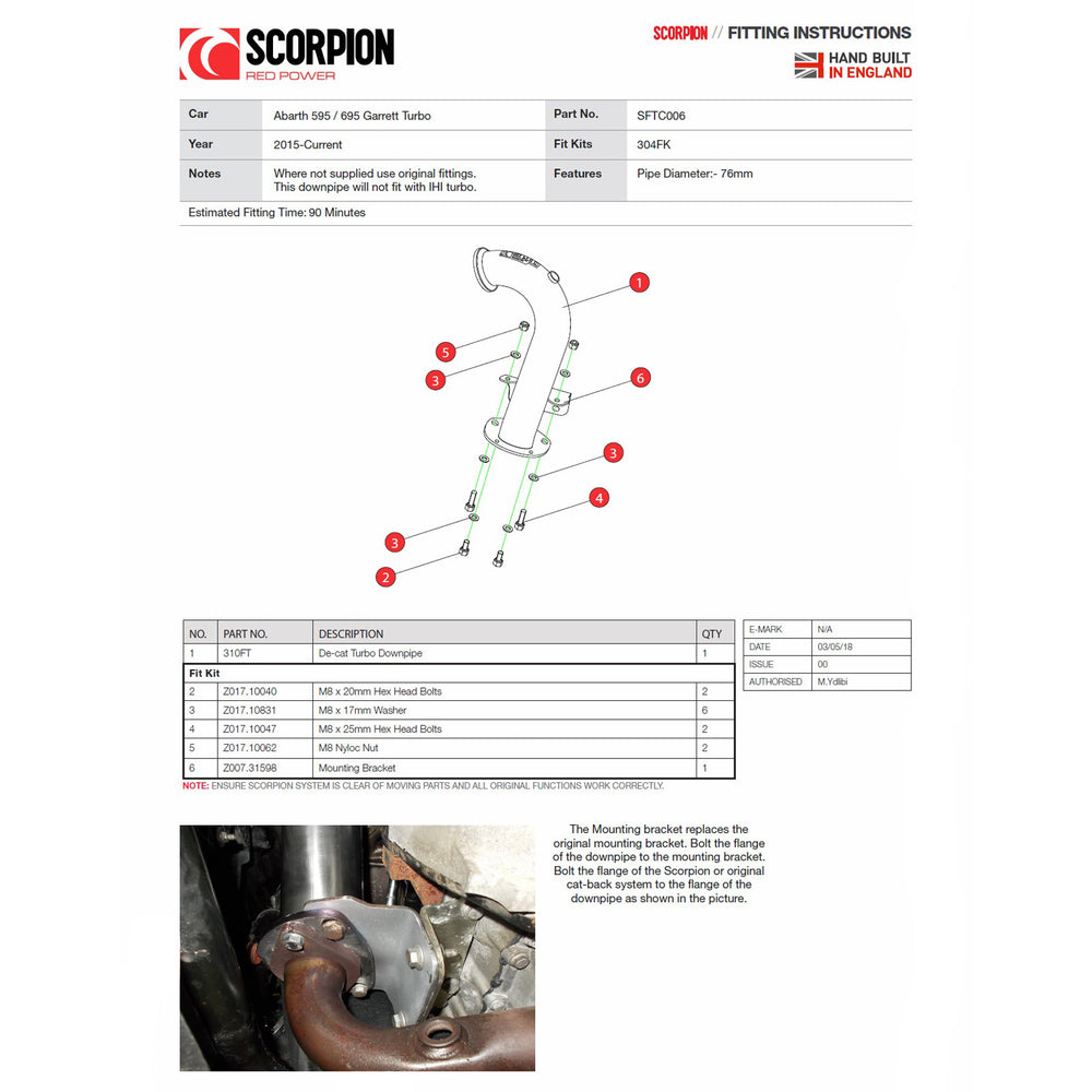 - SFTC006 - Scorpion Car Exhaust De-Cat Downpipe - Fiat 595/695 Abarth 1.4 (Garrett Turbo) 2015 - 2018, consisting of:
