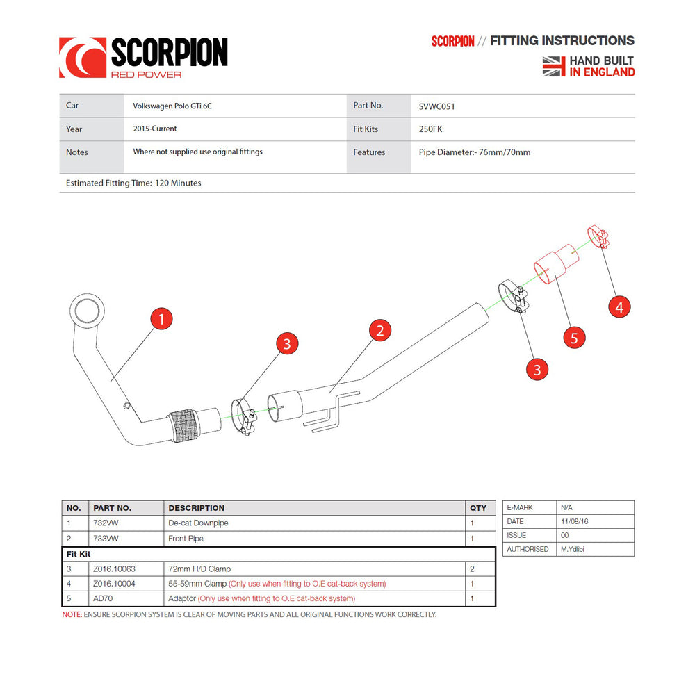 - SVWC051 - Scorpion Car Exhaust De-Cat Downpipe - Volkswagen Polo GTI 1.8T 6C 2015 - 2017, consisting of: