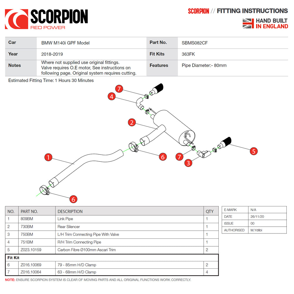 - SBMS082CF - Scorpion Car Exhaust GPF-Back System (Non-Resonated) (Valved) Carbon Fibre Ascari - BMW M140i GPF Model 2018 - 2019, consisting of: