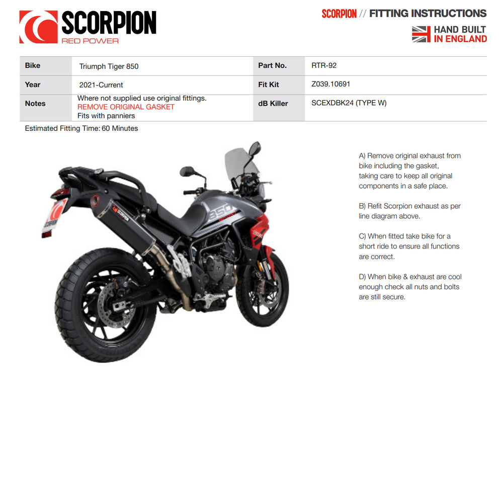 - Fittings/Instructions - All Scorpion products are supplied with everything needed to fit and ride, along with parts drawings and picture instructions where necessary