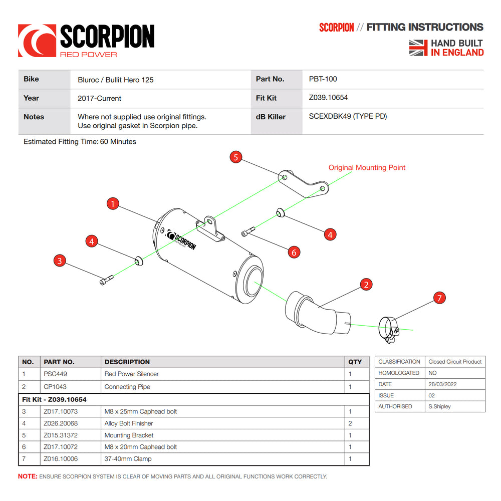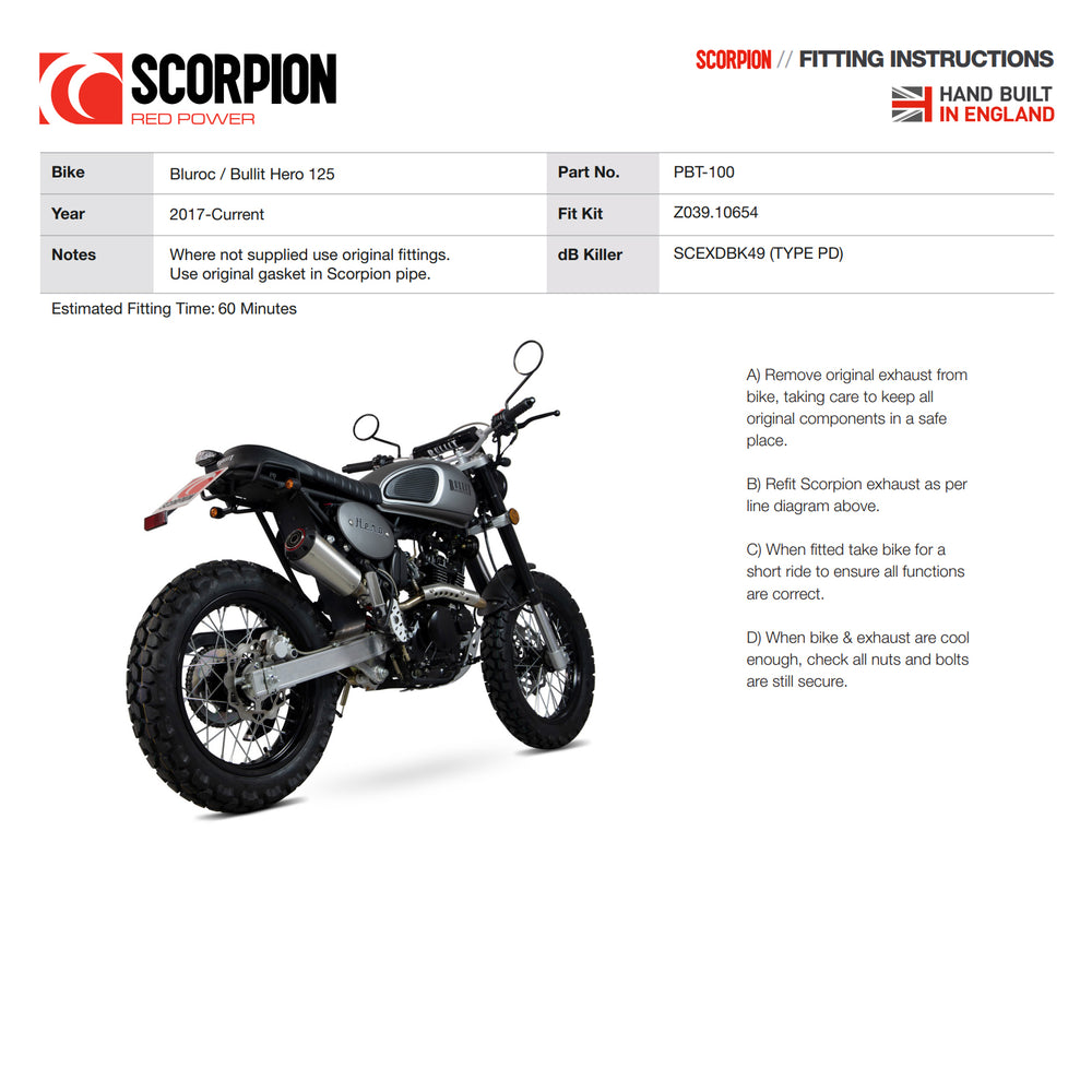 - PBT100SEO - Scorpion Red Power Stainless Steel Slip-On Exhaust - Bullit Hero 125 2017 - 2022, consisting of:
