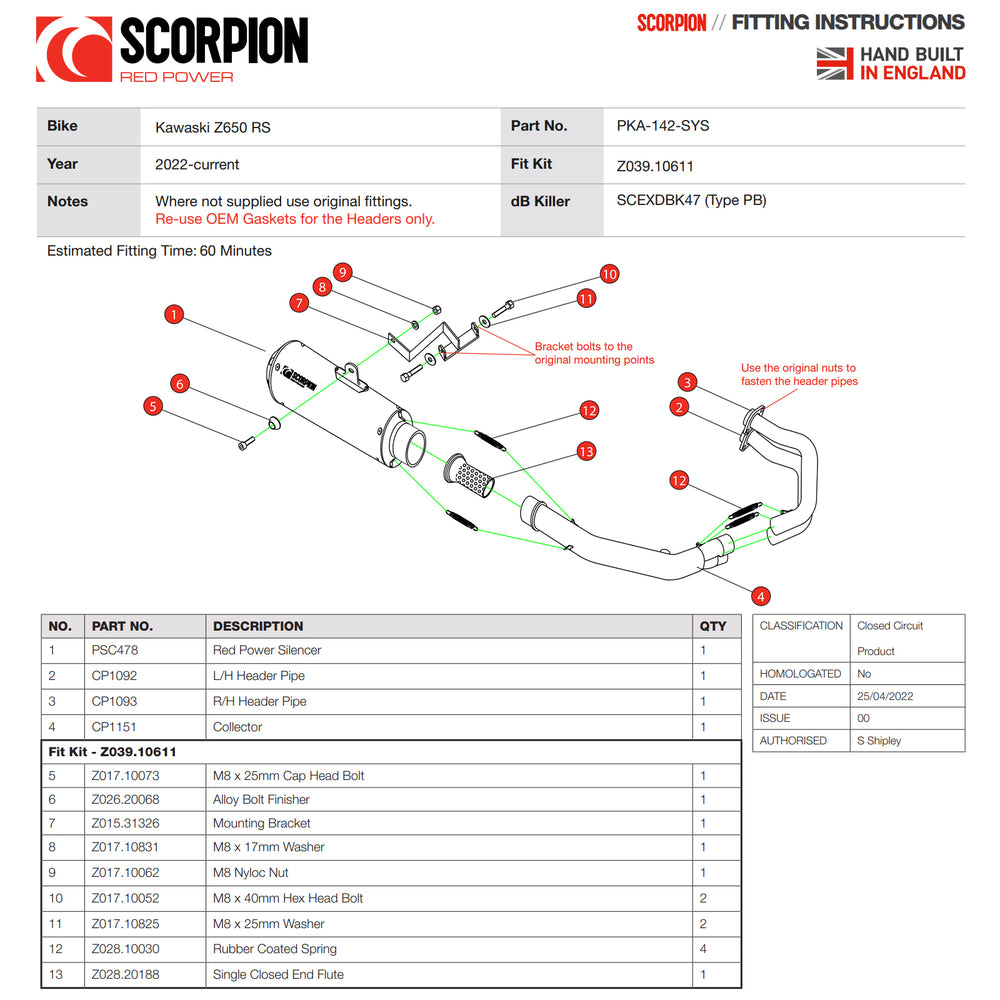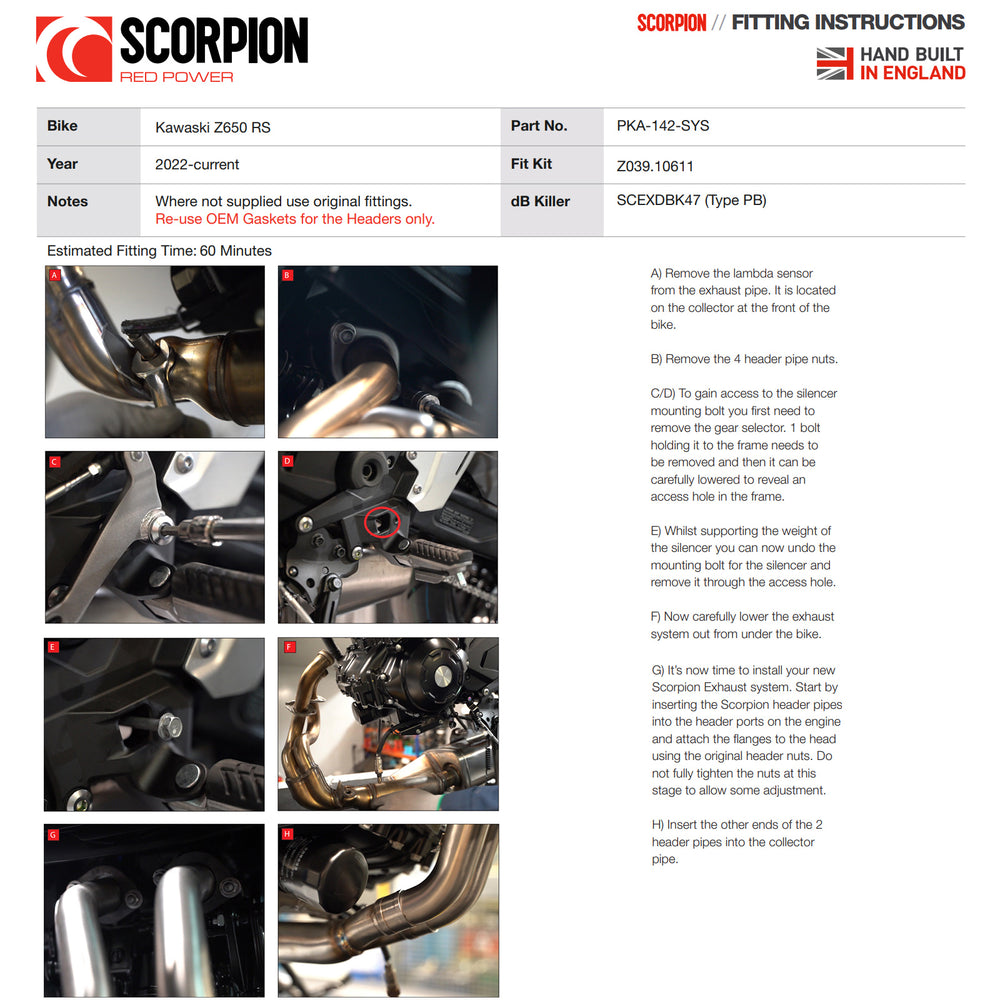 Riders will be able to enjoy a much deeper sportier tone with an improved acoustic range being delivered as well as an instant benefit from sharper throttle response and an increase in bhp. The product offers the bike a generous weight saving to further improve on performance. With detailed fitting instructions included in the box, and a comprehensive fitting guide on Scorpion's YouTube channel - the Z650RS system is a quick and simple system to fit either yourselves or by your customer. The estimated fitting time is 60 minutes.