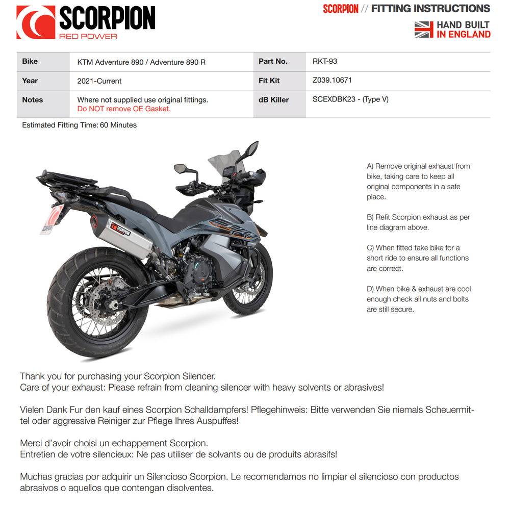 Scorpion are proud to present a brand-new Red Power developed and manufactured slip-on for the KTM Adventure 890 inc R. The slip-on is constructed from premium T304 stainless steel pipework and is provided with full fitting kit for a straightforward installation.