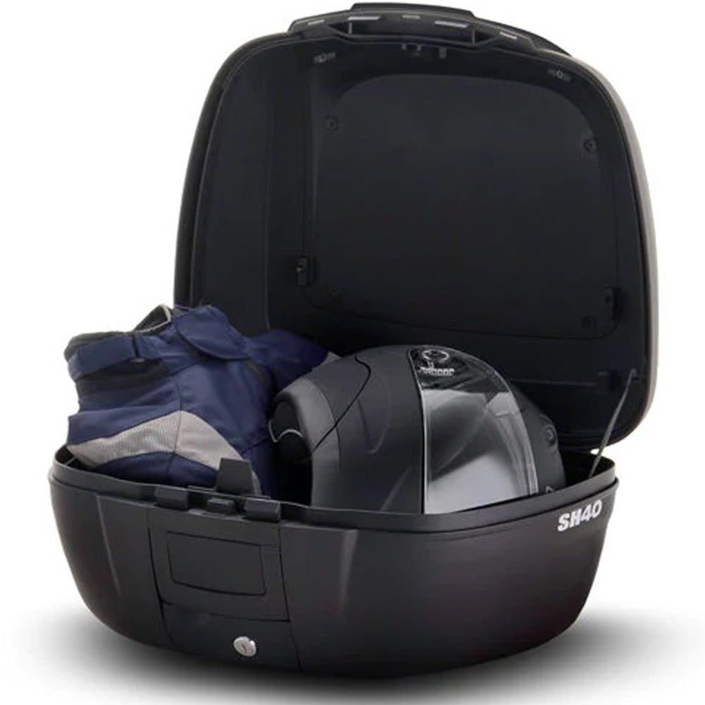 The Shad SH40 Top Case Aluminium 40L is a mid-larger sized box in Shad's top box range, weighing only 3 kg but still being able to carry 2 open face helmets or 1 full face helmet plus accessories making it perfect for all types of bike sizes. The SH40 Aluminium is fully waterproof, aerodynamic, aesthetically designed with a slightly domed front face shape with integrated reflectors and different lid colour options. This top box is highly impact resistant with minimal thickness for ultra lightness. Most bikes require a Shad bike specific top box fitting kit - only a mounting plate is included with the top box.