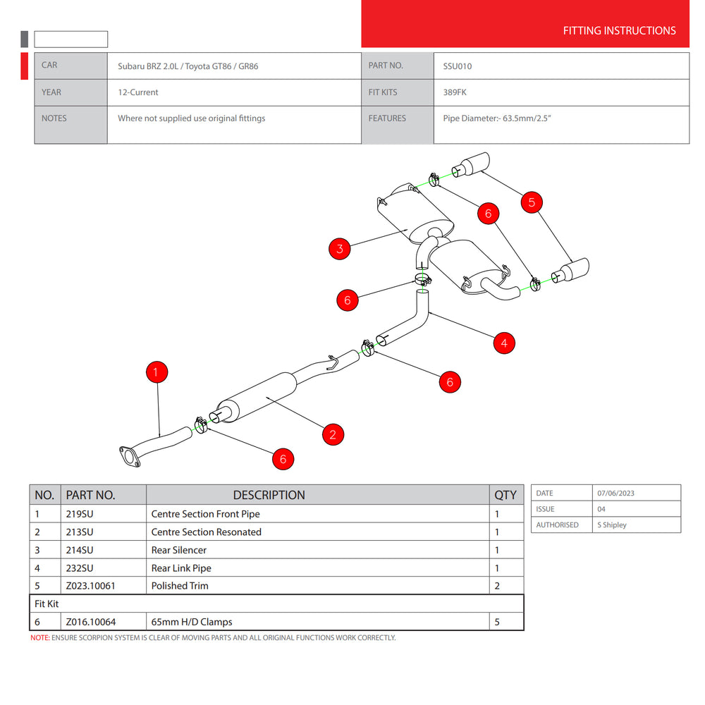 - SSU010 - Scorpion Car Exhaust Cat-Back System (Resonated) Twin 100mm Polished Daytona compatible with Toyota GR86 & Subaru BRZ ZD8 2012 - 2023, consisting of: