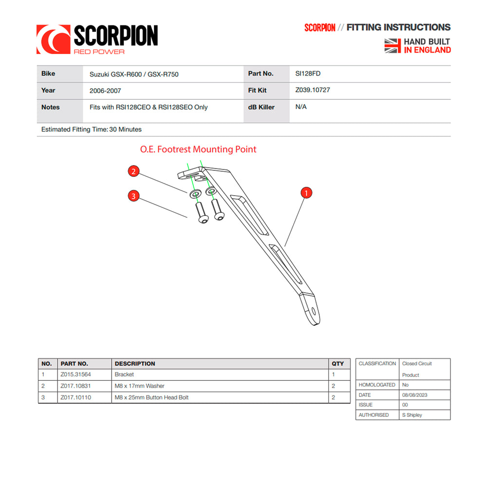 - SI128FD - Scorpion Footrest Delete Kit compatible with Suzuki GSX-R600 & GSX-R750 2006 - 2007, consisting of: