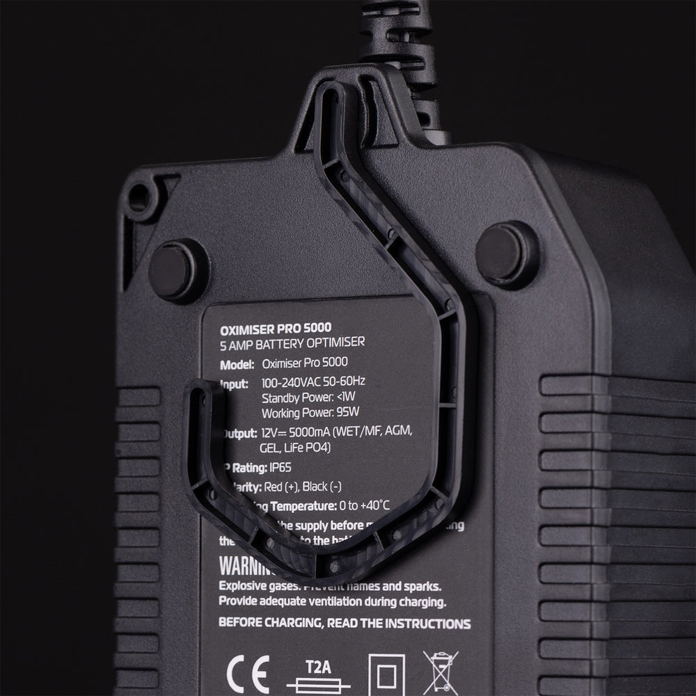 Suitable for use in any environment, the Oximiser Pro's high impact, fire resistant ABS casing is ultrasonically sealed to achieve an IP65 rating. The clear, easy-to-read LCD display assists the user throughout the charging stages and if required, the charger can be lifted off the ground by clipping on a removable hanger.