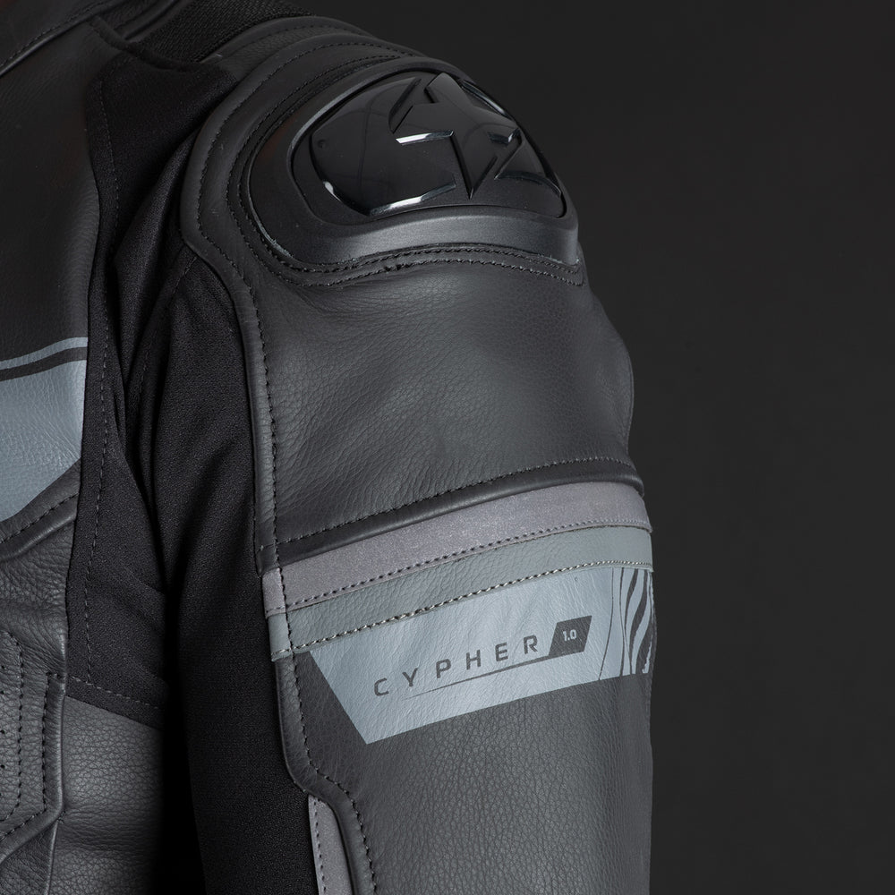 The Cypher 1.0 leather jacket offers CE AA rated protection, internal CE level 1 shoulder and elbow protectors, external TPU abrasion resistant sliders at the shoulders and engineered stretch zones for a flexible fit. This biker jacket is designed for riders who want to make a statement, with its sharp styling, asymmetric print and eye-catching TPU shoulder sliders. Matching boots and gloves available.