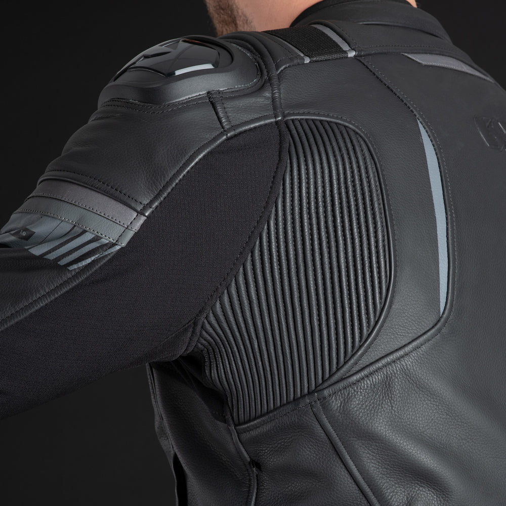 - Accordion leather stretch panels at the upper back and above the elbow offer improved flexibility