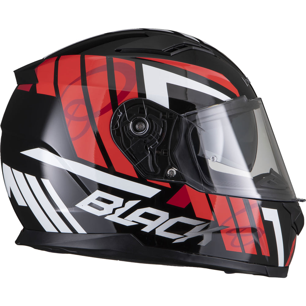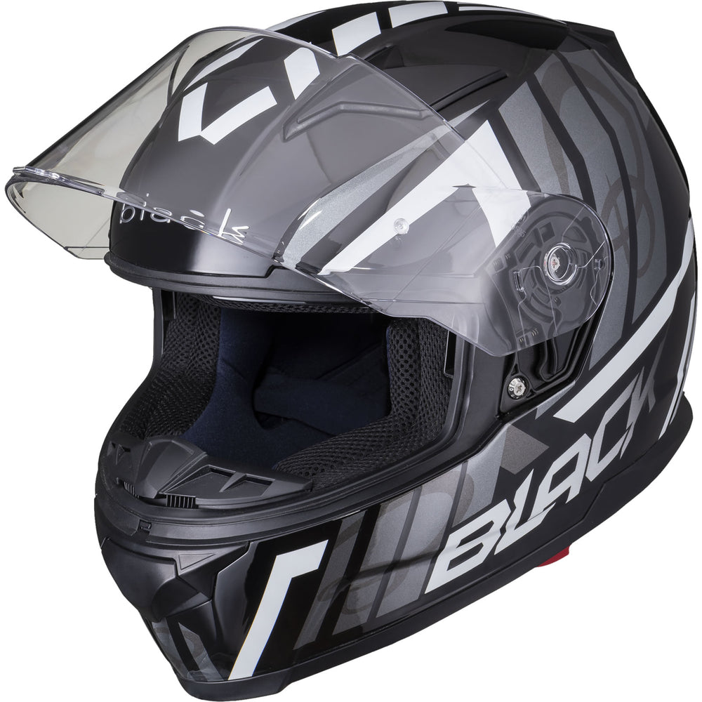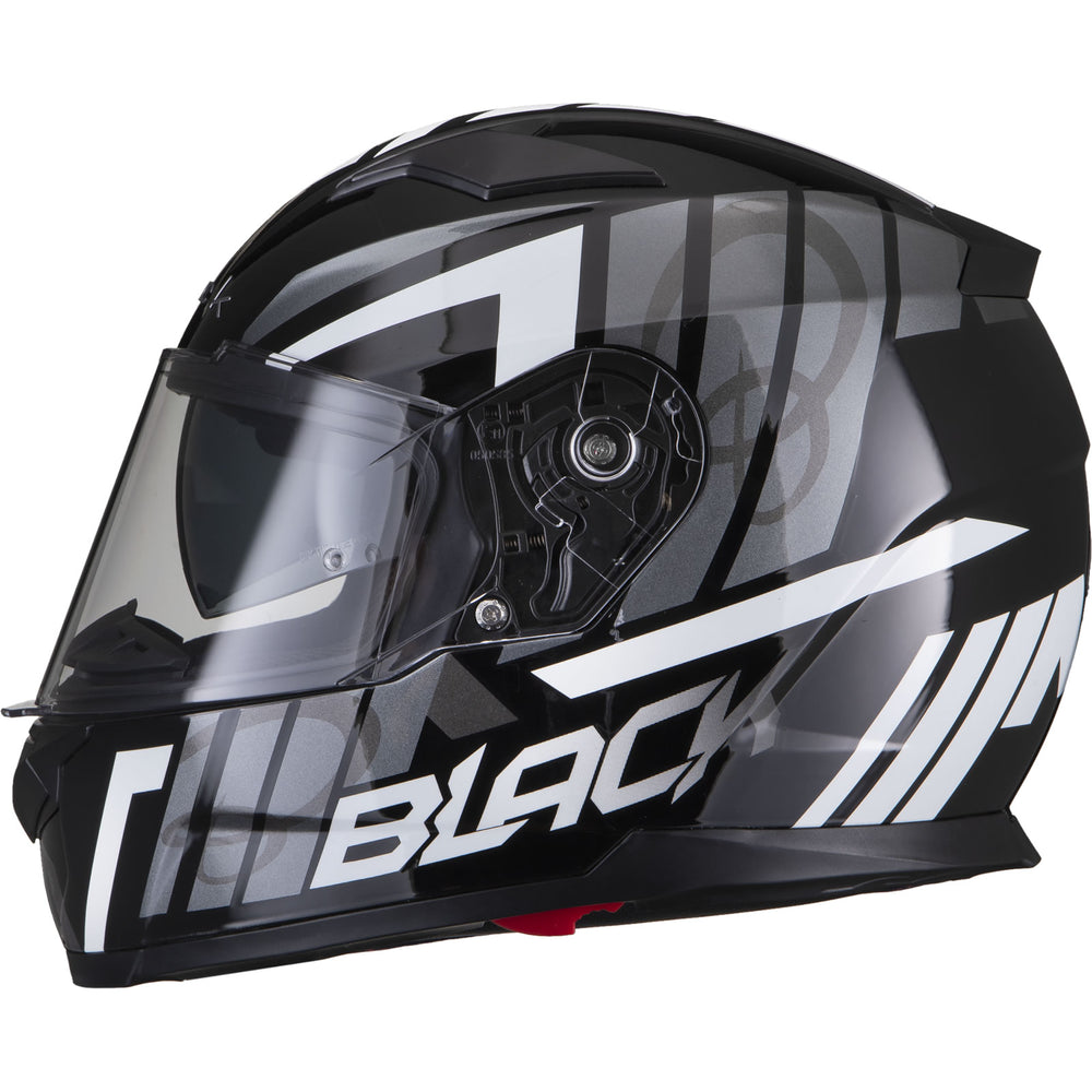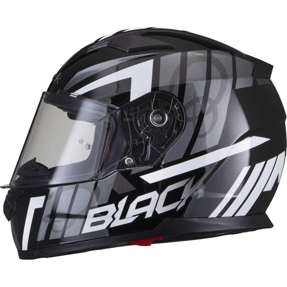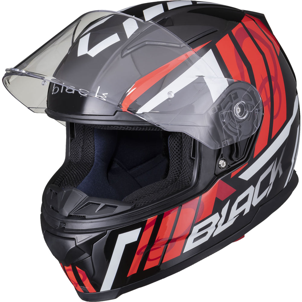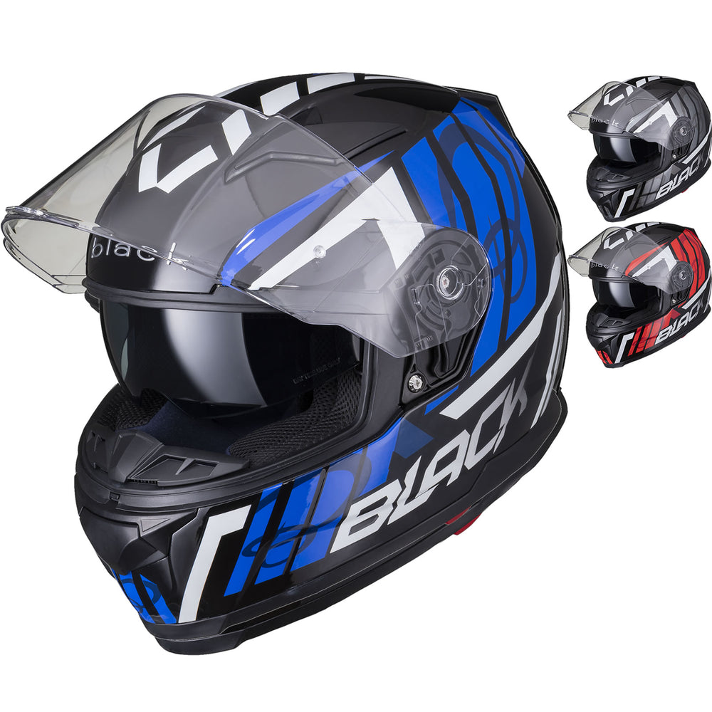 The Black Apex Triple Full Face Motorcycle Helmet is the latest graphic showcased by the newest full Face helmet in the Black helmet range. This full face helmet boasts unmatched shell design thanks to its Advanced Lightweight polycarbonate construction. The premium quality finish is exhibited all around the helmet, whether it be the first-rate graphic available in different colours, the multi-positional Pinlock ready visor that also locks into place, or whether it be the fully removeable liner including chin curtain which also aids in wind noise reduction. The chin vent allows a maximum current of fresh air through, whilst the 2 vents on the top offer a good aerodynamic flow throughout, exiting via the exhaust ports on the rear of the helmet. Fully ECE 22.05 approved for road use throughout Europe. Get the Black Apex Triple helmet today, and be confident your helmet is unmatched in safety and design.
