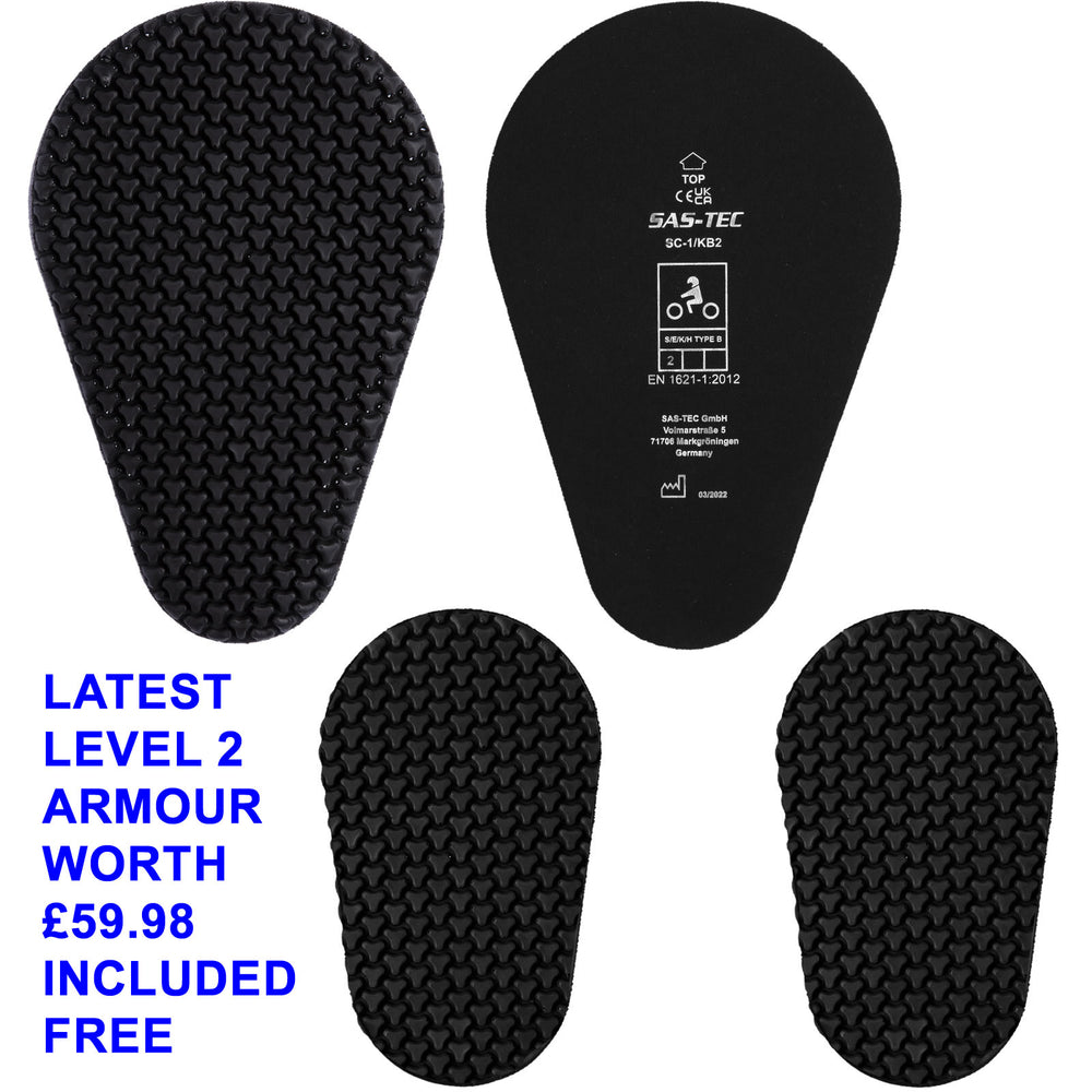 • SAS-TEC CE Level 2 Hip and Knee Armour - The jeans are supplied with SAS-TEC SC-1/HB2 Level 2 CE Approved hip armour inserts and SC-1/KB2 Level 2 CE Approved knee armour inserts for protection, with a combined RRP of Ā£58.98. The protectors surpass the required values of the EN 1621-1:2012, Level 2 requirements, by approximately 10%. They are lightweight, separately washable, not destroyed by an impact and can be reused
