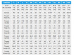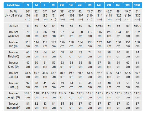 | Trouser Length (G) | 108.5 cm | 110 cm | 111.5 cm | 113 cm | 114.5 cm | 116 cm | 117.5 cm | 117.5 cm | 117.5 cm | 117.5 cm | 117.5 cm | 117.5 cm | 117.5 cm |