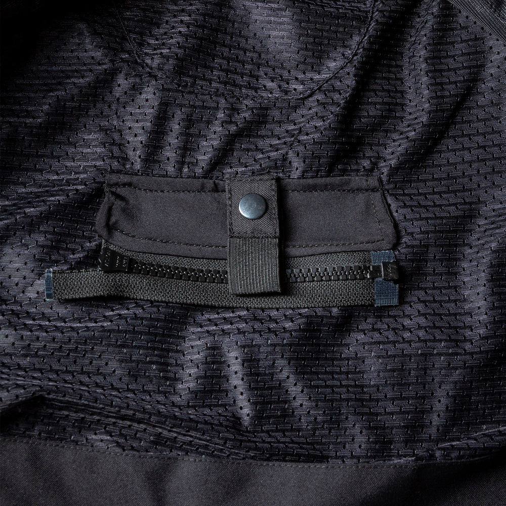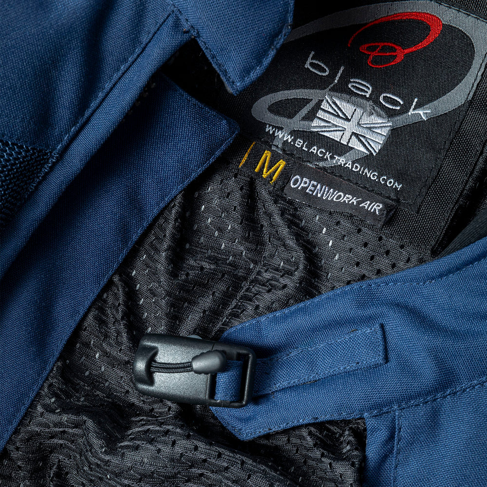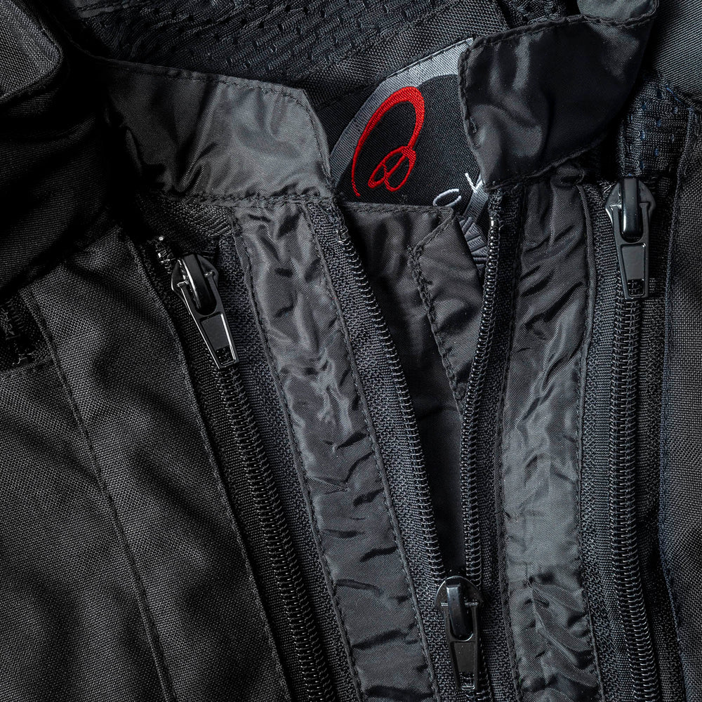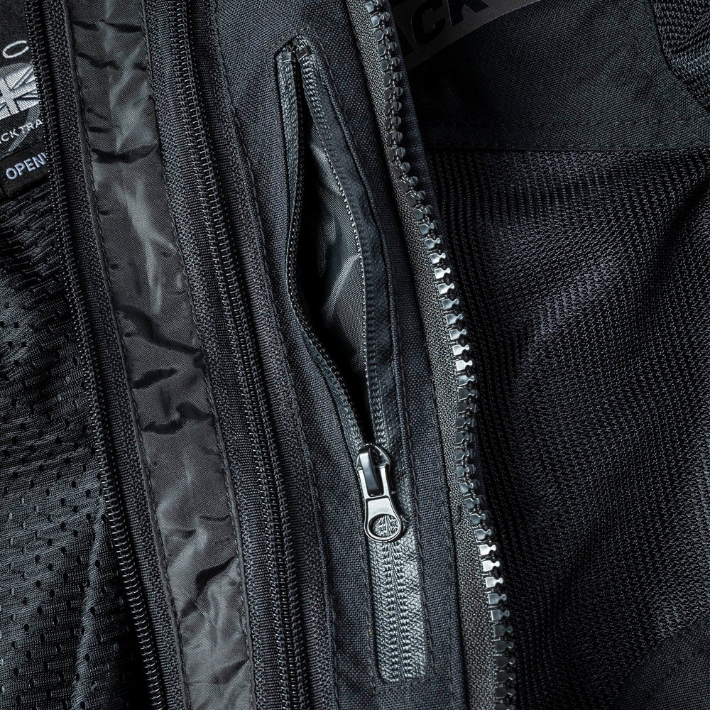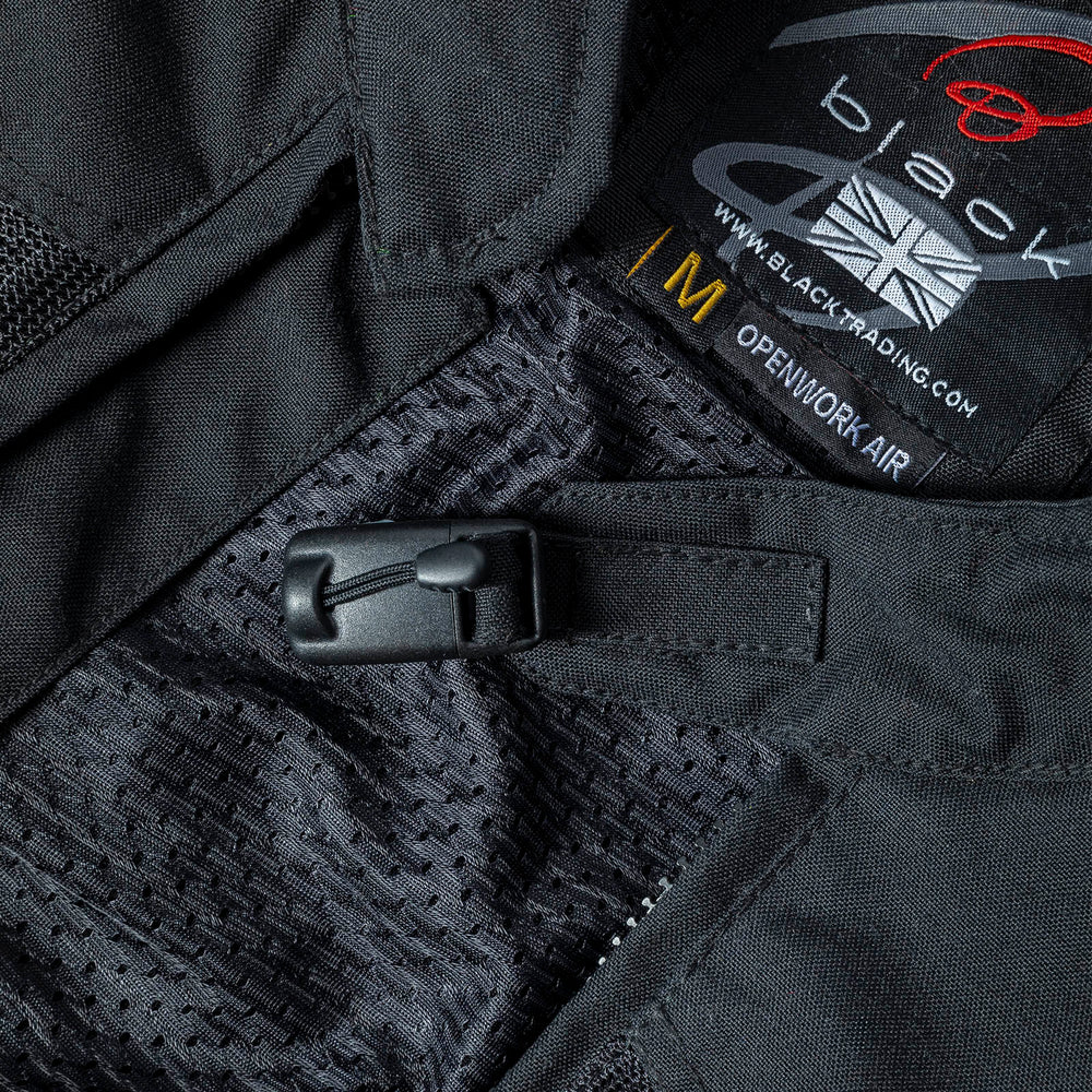 The Black™ Openwork Air is a vented textile riding jacket with a detachable waterproof membrane for use throughout the British summer. Removable CE-Level 2 protectors are standard in the shoulders and elbows, while at the back there is a pocket for an optional back protector (sold separately). Fit adjustment comes in the form of hook-and-loop cuff and waist adjusters, upper arm pop-stud adjusters and a magnetic buckle collar closure with one-time adjustment that will give you the perfect comfort. The jacket has plenty of storage, with 2 external pockets, 2 internal pockets on each layer, and a safe and secure Napoleon pocket. An attachment zip for pairing the jacket with trousers is also included. Compatible trousers include the Black™ Openwork Air Motorcycle Pants, Black™ Zeal Motorcycle Pants and Agrius Airflow Air Motorcycle Pants. Both sides of the trouser attachment zip are supplied so you can use the other half on an existing pair of trousers to make a full suit.