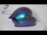 The 'Chameleon' finish of the Black Atom helmet features a two-tone paint, that colour-shifts as the angle changes: from metallic blue to a vibrant metallic purple on the Gloss Chameleon Blue variant, and from metallic green to a more subtle metallic purple on the Matt Chameleon Green variant. This paintwork transforms the helmet into an eye-catching marvel that will captivate everyone's attention!