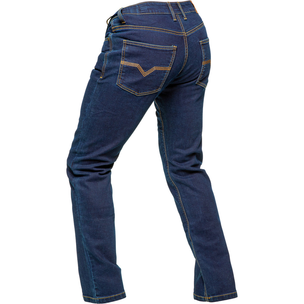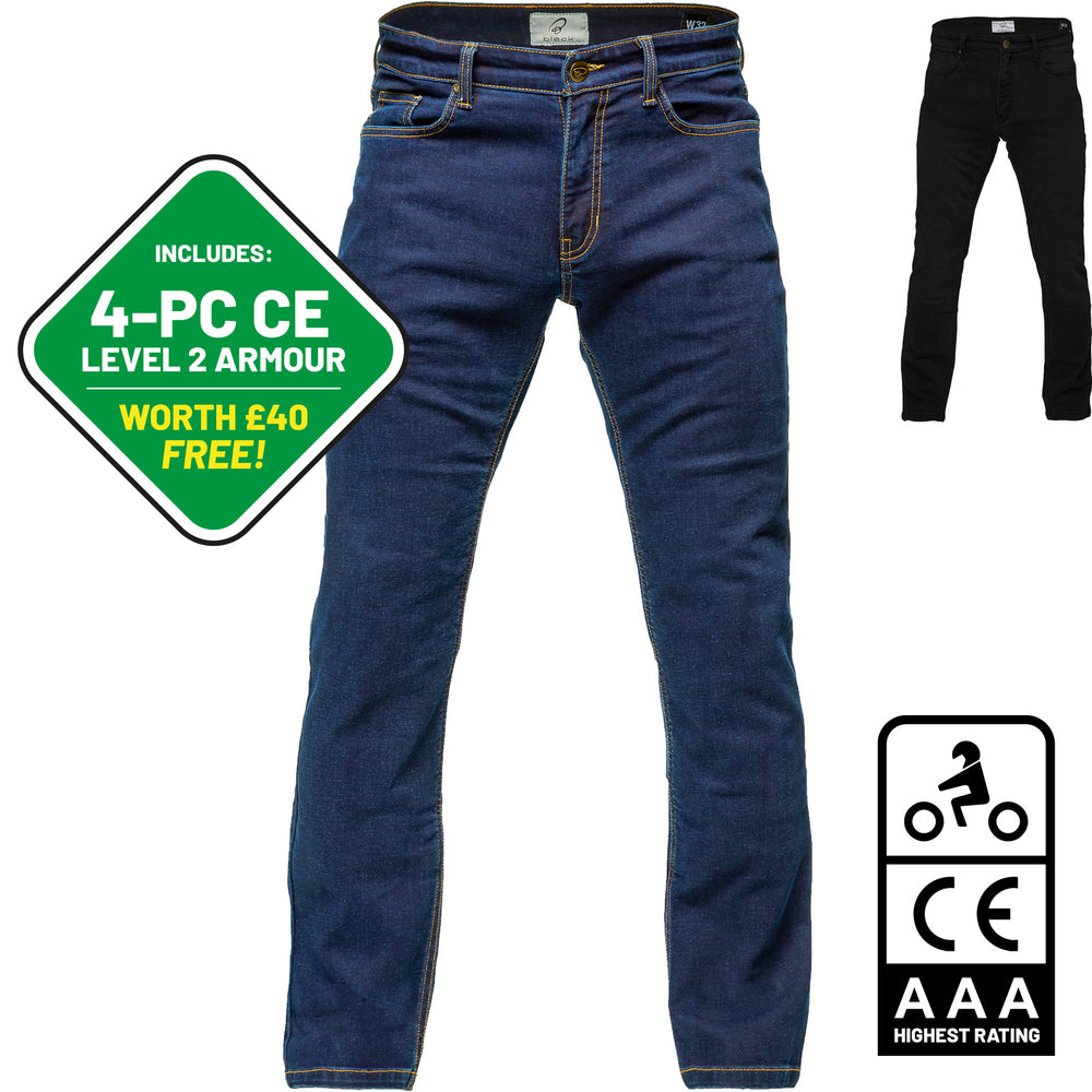 - CE Level 2 Hip and Knee Protectors - The jeans are fitted with Level 2 CE-Approved hip and knee protectors, with a combined RRP of £40. The protectors feature a 3D ventilated design and perform in both high and low temperature environments. They are morphologically shaped to fit the body and are highly flexible and lightweight