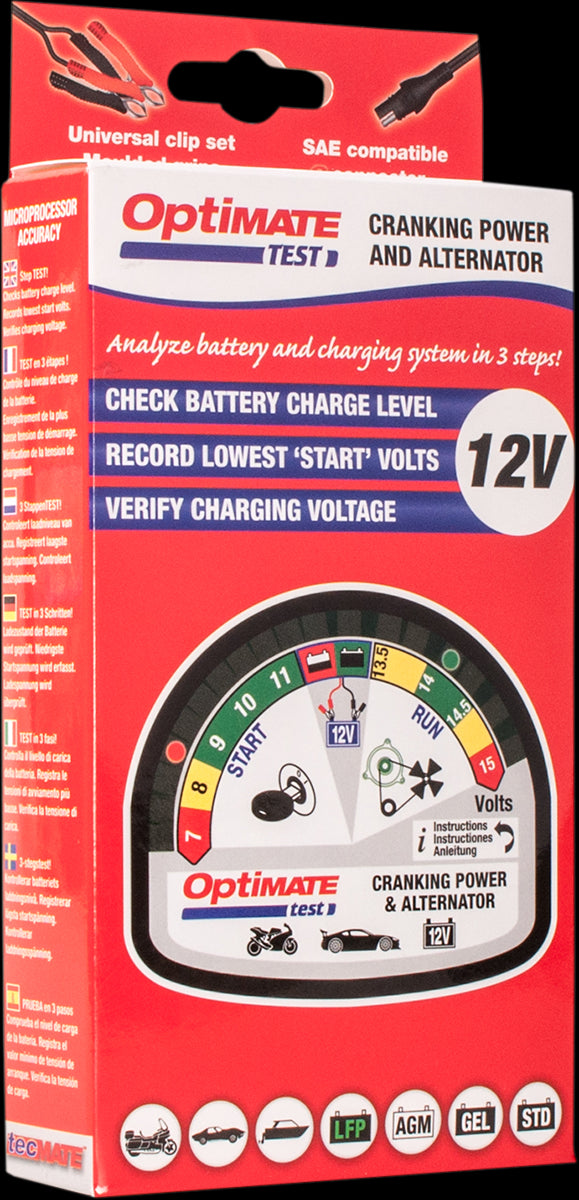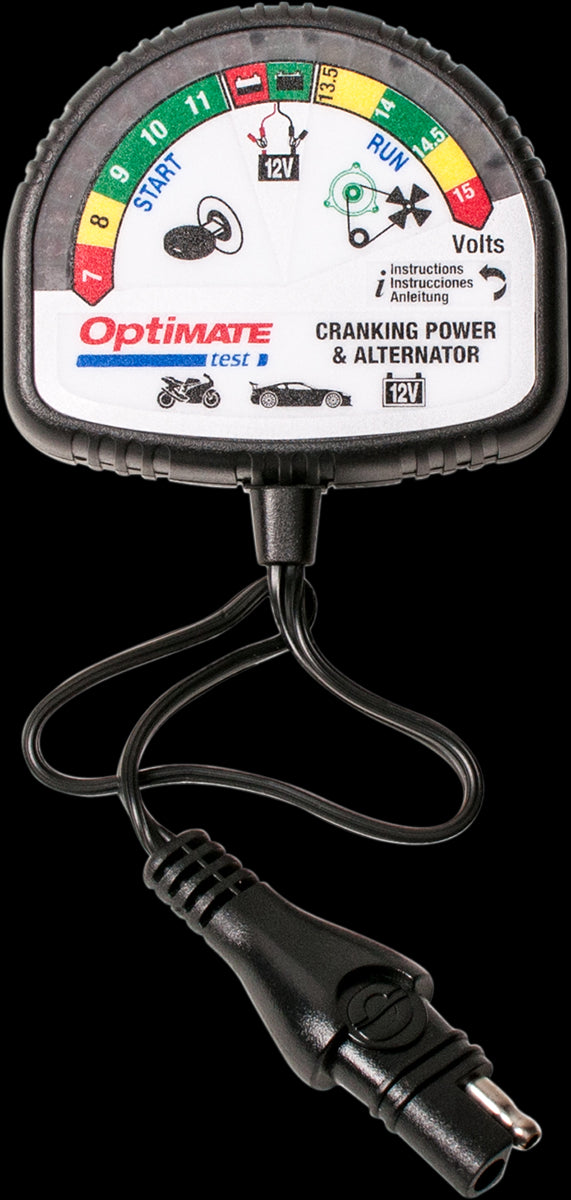 - OptiMate TEST Cranking & Alternator: 12V tester for battery state of charge, cranking performance and vehicle charging system.