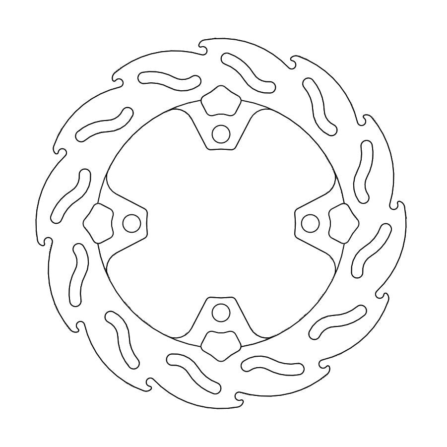 - Flame shaped venting slots and outer perimeter ensure an equal amount of contact surface between the brake pad and disc throughout the whole rotation of the disc.